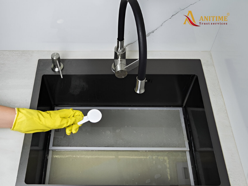 - Đặt lưới lọc vào chậu, rắc đều baking soda lên bề mặt.